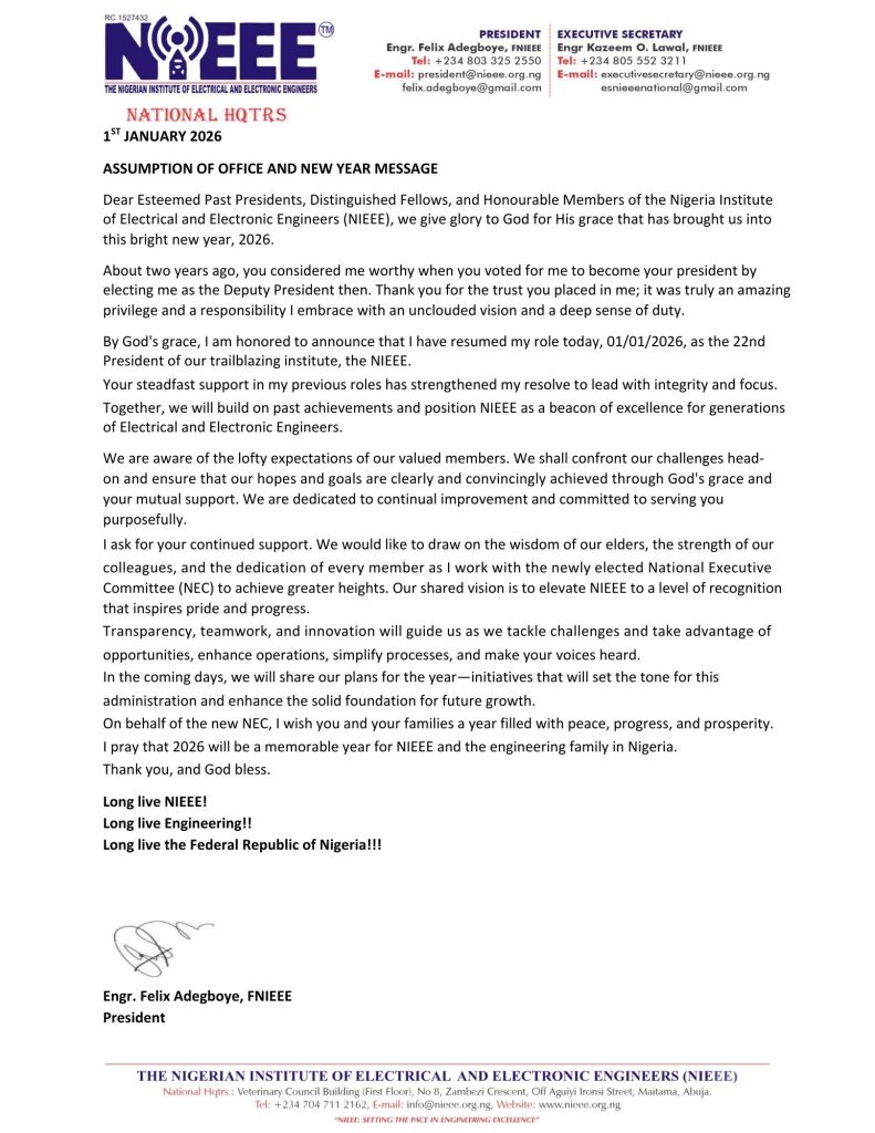 It is with profound gratitude, humility, and a deep sense of responsibility that I’m before you today as the President of the Nigerian Institute of Electrical and Electronic Engineers (NIEEE). By the grace of Almighty God and through the collective confidence reposed in us by our distinguished members, I have the honour to formally inaugurate the newly elected Executive Committee of our great Institute for the 2026 administrative year.
