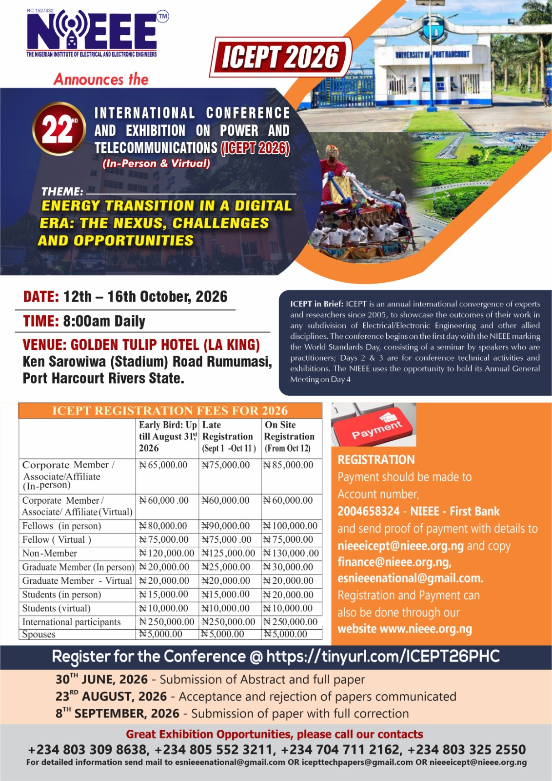 ICEPT is an annual international convergence of experts and researchers since 2005, to showcase the outcomes of their work in any subdivision of Electrical/Electronic Engineering and other allied disciplines The conference begins on the first day with the Institute marking the World Standards Day, consisting of seminars/workshops by speakers who are practitioners; Days 2 & 3 are for conference technical activities and exhibitions.